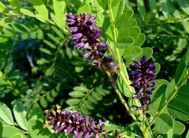 紫穗槐豆科落葉灌木,高1-4米。枝褐色、被柔毛,后變無(wú)毛,葉互生,基部有線形托葉,穗狀花序密被短柔毛,花有短梗;花萼被疏毛或幾無(wú)毛;旗瓣心形,紫色。莢果下垂,微彎曲,頂端具小尖,棕褐色,表面有凸起的疣狀腺點(diǎn)。
