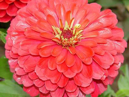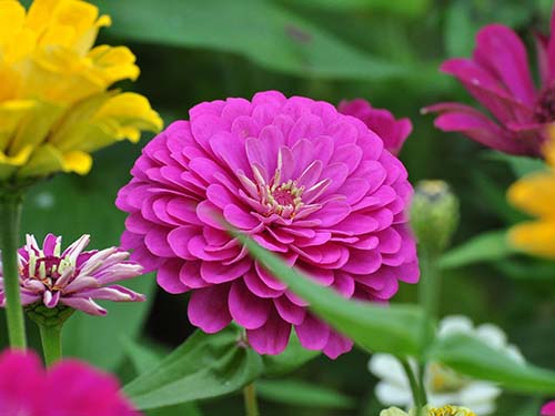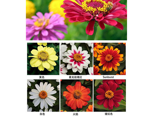 百日草,一年生草本植物。側(cè)枝呈杈狀分枝。夏秋開花,頭狀花序單生枝頂,花徑約10厘米,花瓣顏色多樣,花期長,花型變化多端,基本上都是重瓣種。